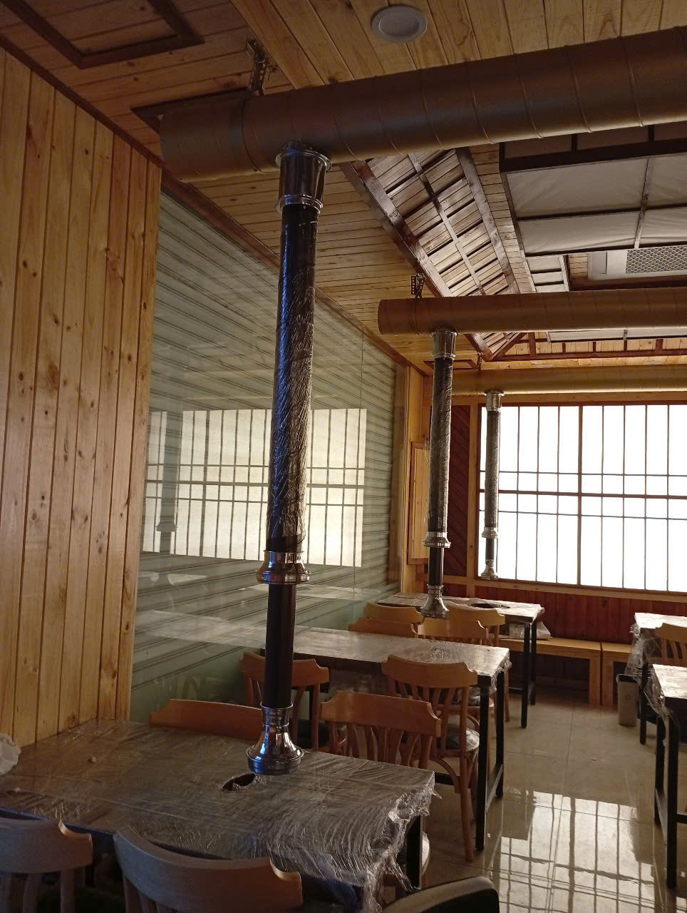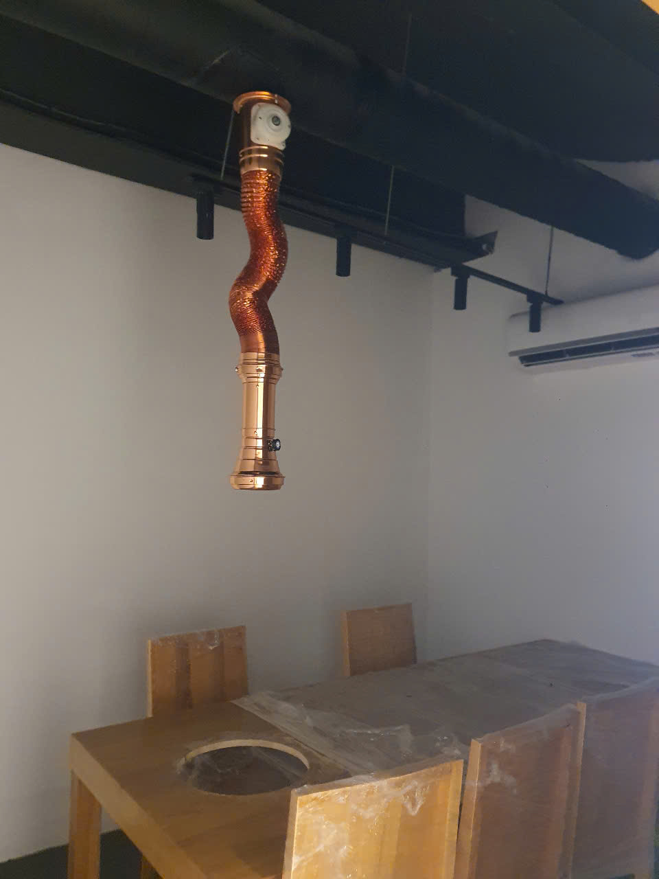 - Hệ thống hút khói dương trần: Là dạng phổ biến, với các ống hút khói được treo từ trần xuống ngay trên từng bếp nướng. Phù hợp cho nhiều loại hình quán nướng, dễ dàng lắp đặt và bảo trì.